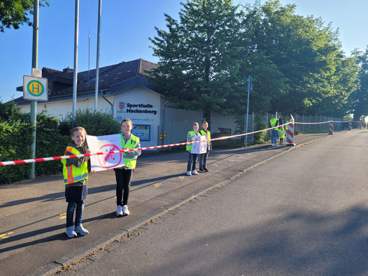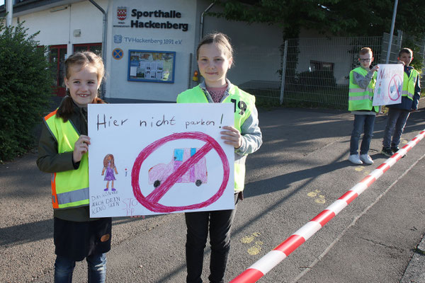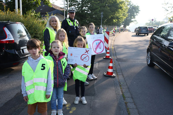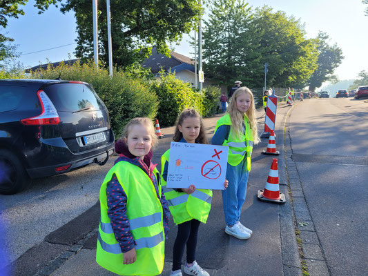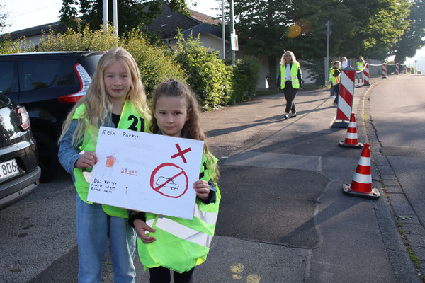 Mit Pylonen und Absperrungen wurde der Bereich markiert und zusätzlich hielten die Kinder Hinweisschilder hoch, auf denen noch einmal dringend darum gebeten wurde, durch richtige Fahrweise und richtiges Parken, die Kinder nicht zu gefährden.