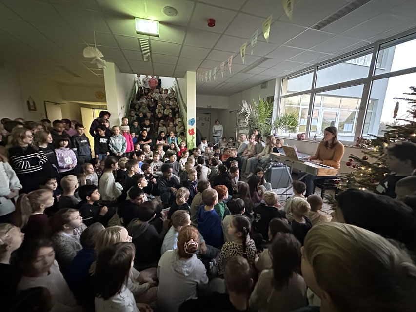 Pünktlich am 1. Dezember versammelten sich in unserem Eingangsbereich alle unsere GrundschülerInnen, LehrerInnen und unsere Schulleitung, um mit weihnachtlichem Singen die Adventszeit einzuläuten. Das funktionierte auch schon prima, was bestimmt auch an unserem