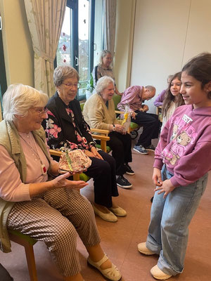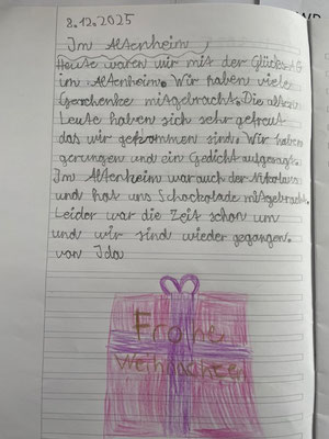 Heute waren wir mit der Talentzeit Glück im Altenheim. Wir haben viele Geschenke mitgebracht. Die alten Leute haben sich sehr gefreut, dass wir gekommen sind. Wir haben gesungen und ein Gedicht aufgesagt. Im Altenheim war auch der Nikolaus und hat uns Schokolade mitgebracht. Leider war die Zeit schon um und wir sind wieder gegangen (von Ida).