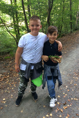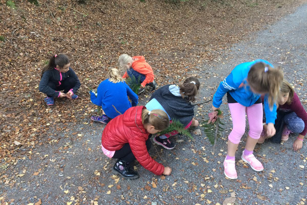 Letzte Woche waren die Klassen 3a und 3b im Wald an der Aggertalsperre. Dort haben wir viel gesammelt. Zum Beispiel Eicheln, Bucheckern, verschiedene Blätter, Moos und Tannenzapfen. Wir haben sogar einen Pilz gesehen.