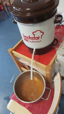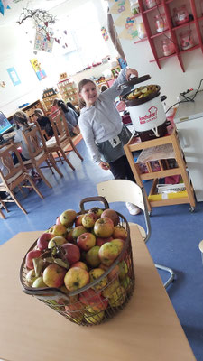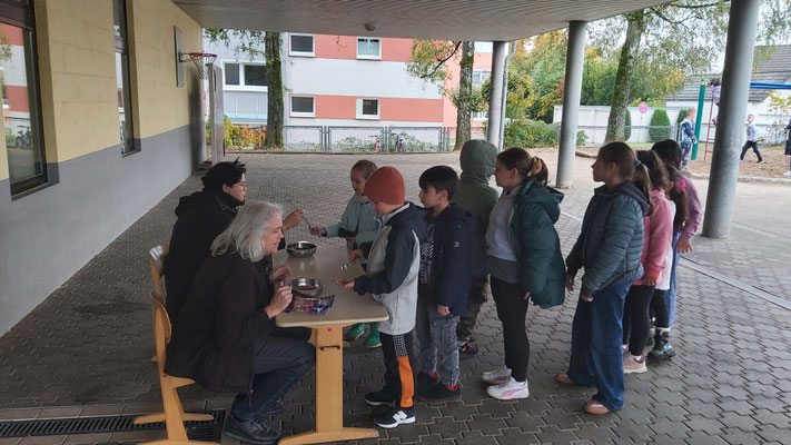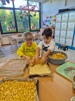 Im Jahr 2021 pflanzten wir auf dem Schulgelände Obstbäume. Jetzt, im Jahr 2025, haben wir ganz viele Äpfel geerntet, von unseren Bäumen und auch von anderen Apfelbäumen gab es reichlich Früchte. Wir haben viele Kuchen gebacken und sogar ausgiebig Apfelsaft hergestellt, damit alle Kinder frischen Saft genießen konnten.