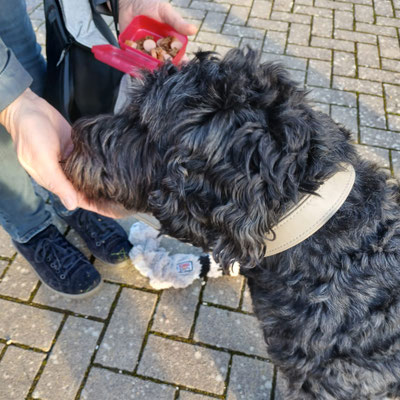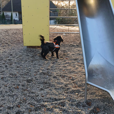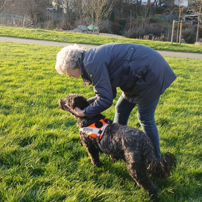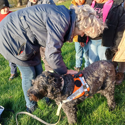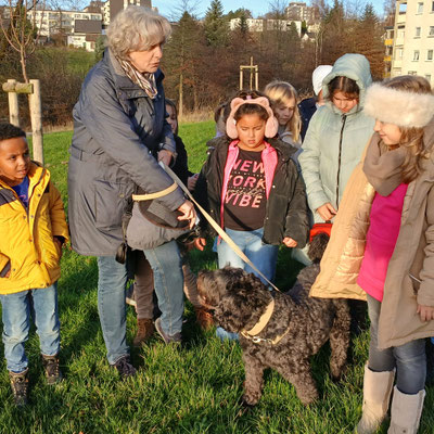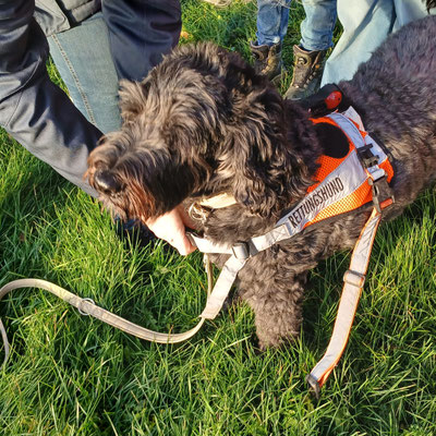 Knut, unser OGS-Hund und gleichzeitig ausgebildeter Rettungshund, begleitete gemeinsam mit einigen Kindern die Suche. Bevor die Suche beginnen konnte, legte Frau Liesen ihm seine Rettungsweste und eine kleine Glocke an, und auf ihr Kommando gings los.