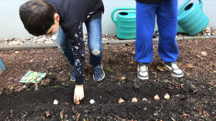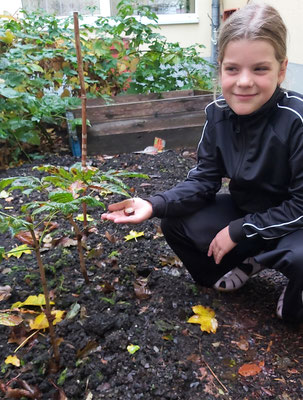 Unsere Kastanien- und Eichelbäume, die wir vor einigen Jahren aus Kastanien und Eicheln in unserem OGS-Garten aufgezogen haben, ziehen nun in den Wald um. Dort steht ihnen ausreichend Raum zur Verfügung und sie profitieren vom Waldboden für ihr weiteres Wachstum.
