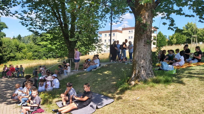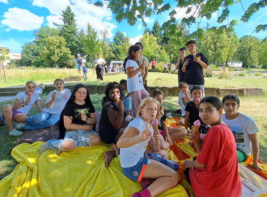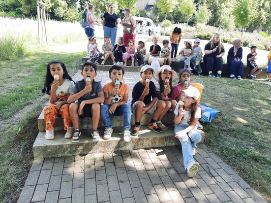 Dann fand unsere Jahresabschlussfeier im Bergpark auf dem Hackenberg statt. Alle Kinder der OGS waren dabei! Es gab ein gemütliches Picknick mit leckeren, selbstgebackenen Waffeln, Getränken und Snacks. Unter den großen Bäumen war die Stimmung richtig schön. Die Kinder erzählten lustige Geschichten aus der OGS und spielten im Park fröhliche Spiele, die viel Spaß machten. Das Beste war der Eiswagen! Jedes Kind durfte sich seine Lieblingskugel aussuchen und genüsslich schlecken. Das war ein toller Abschluss!