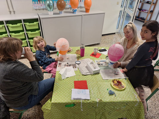 Nun sollte die Geschichte mit Bewegungen umgesetzt werden. Die Geschichte wurde erneut vorgelesen. Dabei zogen die Kinder sich mit Begeisterung die Astronautenanzüge an, starteten mit einer Rakete ins All und genossen die Schwerelosigkeit. Sie kurvten um verschiedene Planeten herum und erlebten einige spektakuläre Abenteuer auf ihrem Weltraumflug, bevor sie mit einem Fallschirm wieder sicher zur Erde zurückkehrten. Die Kinder hatten bei dieser Vorleseaktion einen riesigen Spaß.