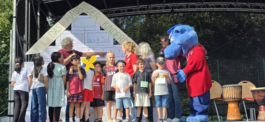 Auf dem Hackenberg wurde der Weltkindertag, wie jedes Jahr, mit besonderem Engagement gefeiert. Die OGS machte die Rechte der Kinder sichtbar. Im Vorfeld schrieben die Kinder in der OGS Kinderrechte auf Plakate, gestalteten diese farbenfroh und kleben sie auf große Kartons. Am Weltkindertag setzten sie die Kartons zu einem Haus zusammen, welches von Käpten Blaubär bewundert wurde.