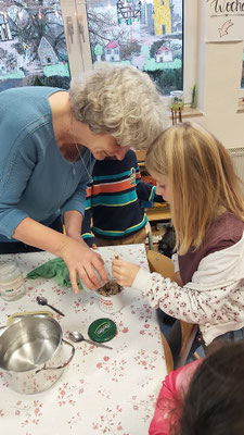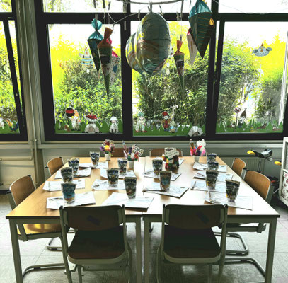 Die Körbchen wurden liebevoll mit kleinen Hasen, Vögeln, Hühnern und Trockenblumen dekoriert. Während alle Kinder und Gäste kreativ tätig waren, versorgten einige Kinder die Besucher mit Kaffee und köstlichen Naschereien.
