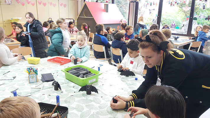 Daraufhin wurde in jeder Gruppe das Thema Fledermäuse aufgegriffen und umgesetzt. Die Kinder bastelten kreative Fledermaus-Modelle aus unterschiedlichen Materialien, malten Bilder und erweiterten ihr Wissen über Fledermäuse anhand von Fachliteratur.