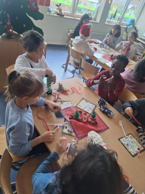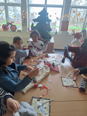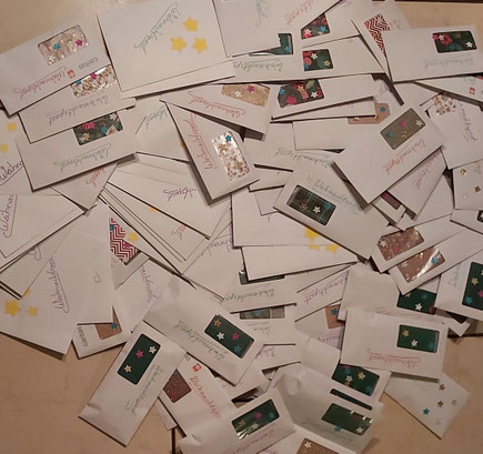 Neben den liebevollen Worten legten die Kinder auch selbstgebastelte Kleinigkeiten in die Umschläge. Es entstanden bunte Sterne aus Papier, kleine Engel aus Filz und gefaltete Weihnachtsbäumchen.